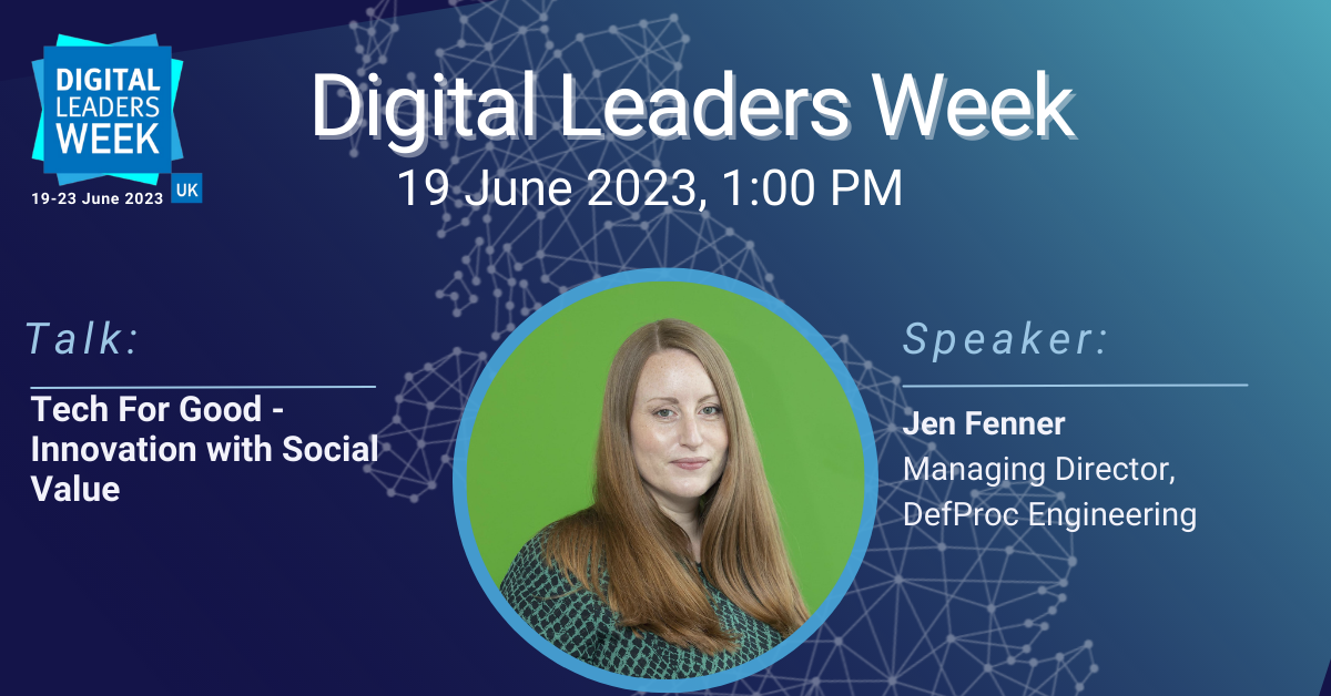 On Monday 19th June at 1 PM, Jen will be hosting an online talk for Digital Leaders Week UK. This week-long event is a programme of free talks, conferences and workshops. You can access knowledge, networking and skills to help eliminate the issues holding back digital transformation in the UK. Jen will share how DefProc combines innovation with social value to create tech for good projects and services. On top of this, she will also explore how different tech for good can look across various sectors. Sign up for this free talk.